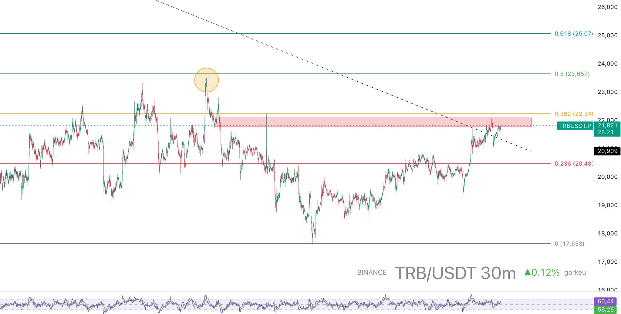 gorkeu TA_Analyst Trader B17.75K @Gorkeu📈 #TRB has been moving sideways for a long time. Currently the price is at the $21.80 resistance. I am adding to the spot position as well. Active resistances at $22.50‑23.00 are critically important; if this zone is breached, upward momentum will strengthen. For full bullishness, closing 4h/8h candles above $23.65 will be sufficient initially. Short‑term support at $21.00 does not appear problematic as long as it is not lost; even if it falls, it should not be confirmed! https://t.co/phrUC6rtsD