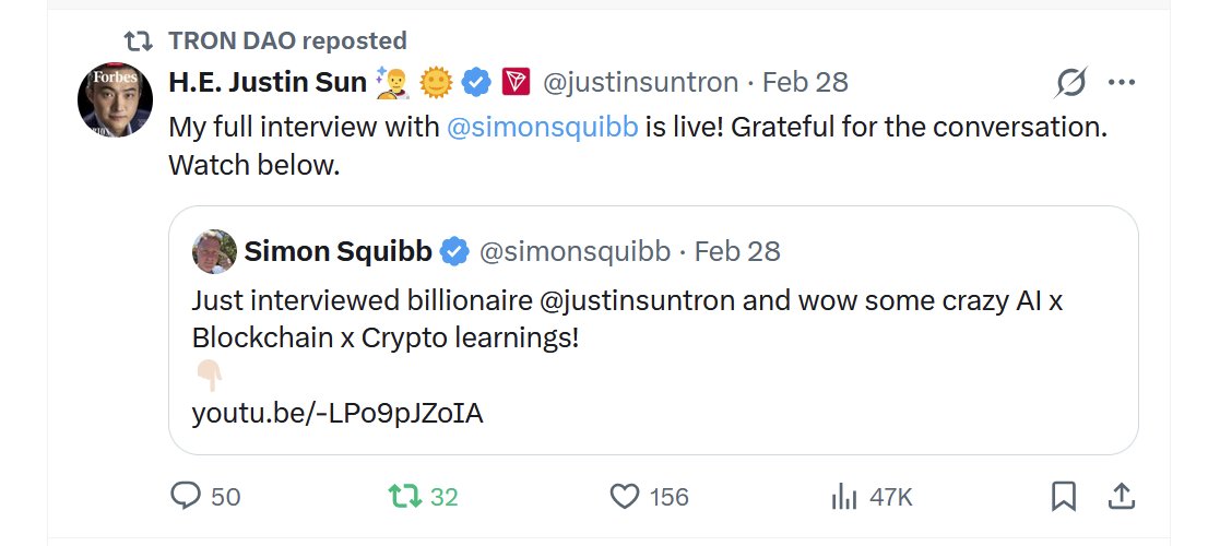 Hồng Ngọc | Ruby💎 DeFi_Expert Influencer B18.00K @hongngo38104169The conversation between Justin Sun and Simon Squibb is more than just an interview — it’s a window into how AI, blockchain, and crypto are converging to shape the next era of the internet. In this full discussion, Justin Sun shares insights drawn from building one of the world’s most active blockchain ecosystems, highlighting how decentralization is evolving from a technical concept into real-world infrastructure powering payments, stablecoins, and digital ownership. The dialogue explores how blockchain transparency and AI intelligence can complement each other to create systems that are more open, efficient, and accessible to everyone. Simon Squibb’s questions dig into the mindset behind innovation — from risk-taking and long-term vision to recognizing opportunities where technology meets human needs. Together, they unpack the growing intersection of AI and crypto, showing how automation, data transparency, and decentralized networks can unlock new economic models and empower global participation. As AI continues to accelerate and blockchain adoption expands, conversations like this help bridge the gap between builders, investors, and everyday users trying to understand what the future holds. This interview is a must-watch for anyone curious about where AI meets Web3, how decentralized infrastructure is reshaping finance, and why open ecosystems may define the next digital revolution. Watch the full conversation and discover the ideas driving the future of AI × Blockchain innovation 👇 @trondao @justinsuntron #TRONEcoStar