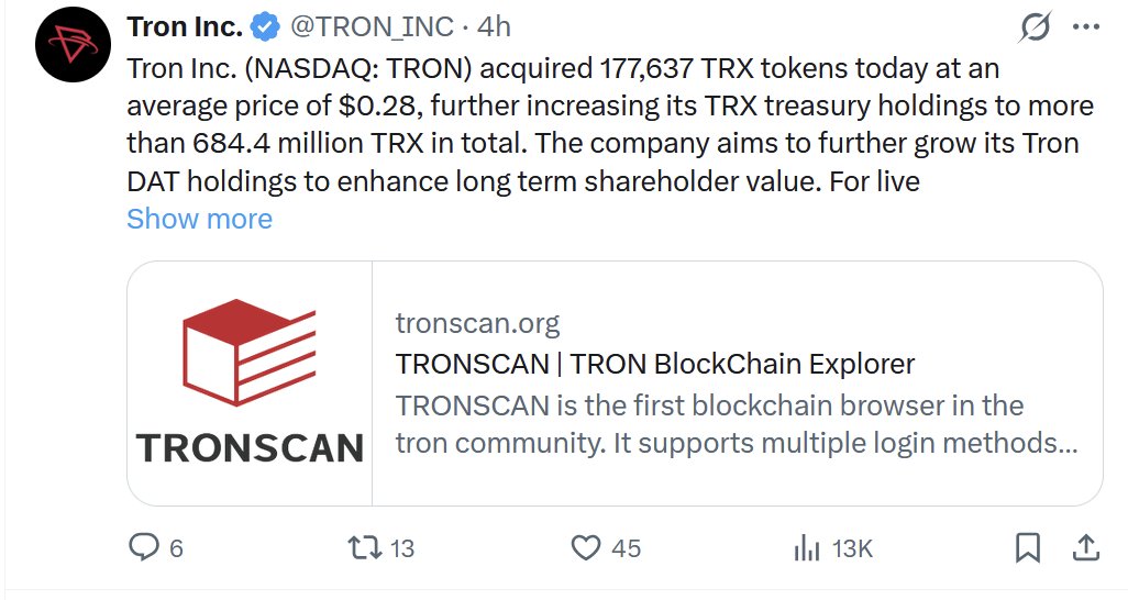 Tron Inc. D2.43K @TRON_INCTron Inc. (NASDAQ: TRON) acquired 177,637 TRX tokens today at an average price of $0.28, further increasing its TRX treasury holdings to more than 684.4 million TRX in total. The company aims to further grow its Tron DAT holdings to enhance long term shareholder value. For live update on the designated on-chain TRX treasury wallet for Tron Inc., please refer to: https://t.co/UYZgaRvn97.