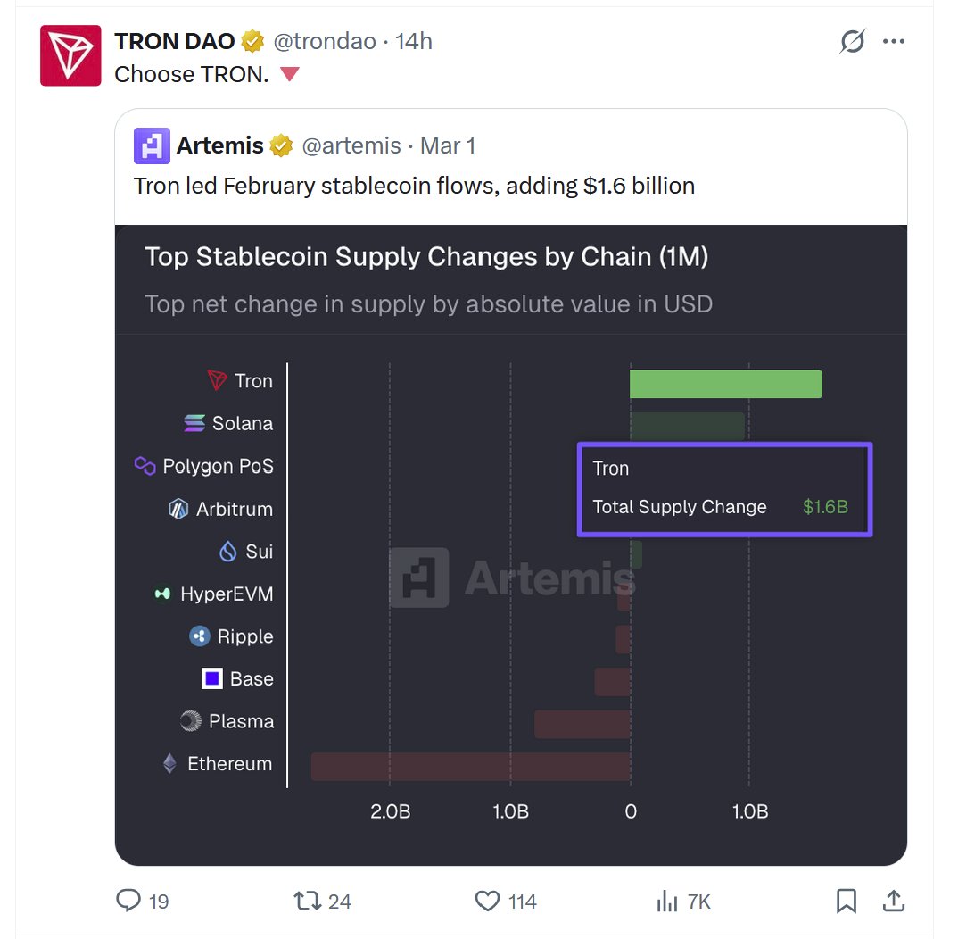 Hồng Ngọc | Ruby💎 DeFi_Expert Influencer B18.00K @hongngo38104169February closed with a clear signal about where stablecoin momentum is concentrating — and the data points decisively toward TRON DAO. @trondao According to on-chain analytics shared by Artemis, TRON led all blockchains in stablecoin supply growth over the past month, adding approximately $1.6 billion in net inflows. This surge placed TRON ahead of competing networks and reinforced its position as one of the primary settlement layers for dollar-denominated liquidity. Stablecoins have become the backbone of on-chain finance. They power trading, remittances, DeFi lending, payments, and cross-border settlement. When supply expands significantly on a specific chain, it typically reflects rising real usage rather than speculative activity. TRON’s growth suggests sustained demand for fast, low-cost transactions and reliable settlement infrastructure. Several structural advantages continue to attract stablecoin activity to TRON: • Low transaction costs enabling microtransactions and high-frequency transfers • Fast settlement speeds supporting real-time global payments • Deep liquidity circulation across exchanges, wallets, and DeFi platforms • Strong USDT dominance powering cross-border value movement • Scalable infrastructure capable of handling large transaction volumes While other networks experienced smaller gains or even net outflows, TRON’s positive supply expansion underscores its role as a critical liquidity hub in the evolving digital dollar economy. This growth is especially important as stablecoins increasingly serve real-world financial needs — from remittances and merchant payments to institutional settlement rails. As global users seek efficient alternatives to traditional banking corridors, networks that prioritize speed, cost efficiency, and reliability are gaining strategic relevance. TRON’s continued dominance in stablecoin flows reflects more than short-term growth metrics; it highlights a broader shift toward blockchain-powered financial infrastructure operating at global scale. In a market defined by utility and efficiency, the message is becoming clearer: liquidity follows usability — and usability is driving stablecoin expansion on TRON. @justinsuntron #TRONEcoStar