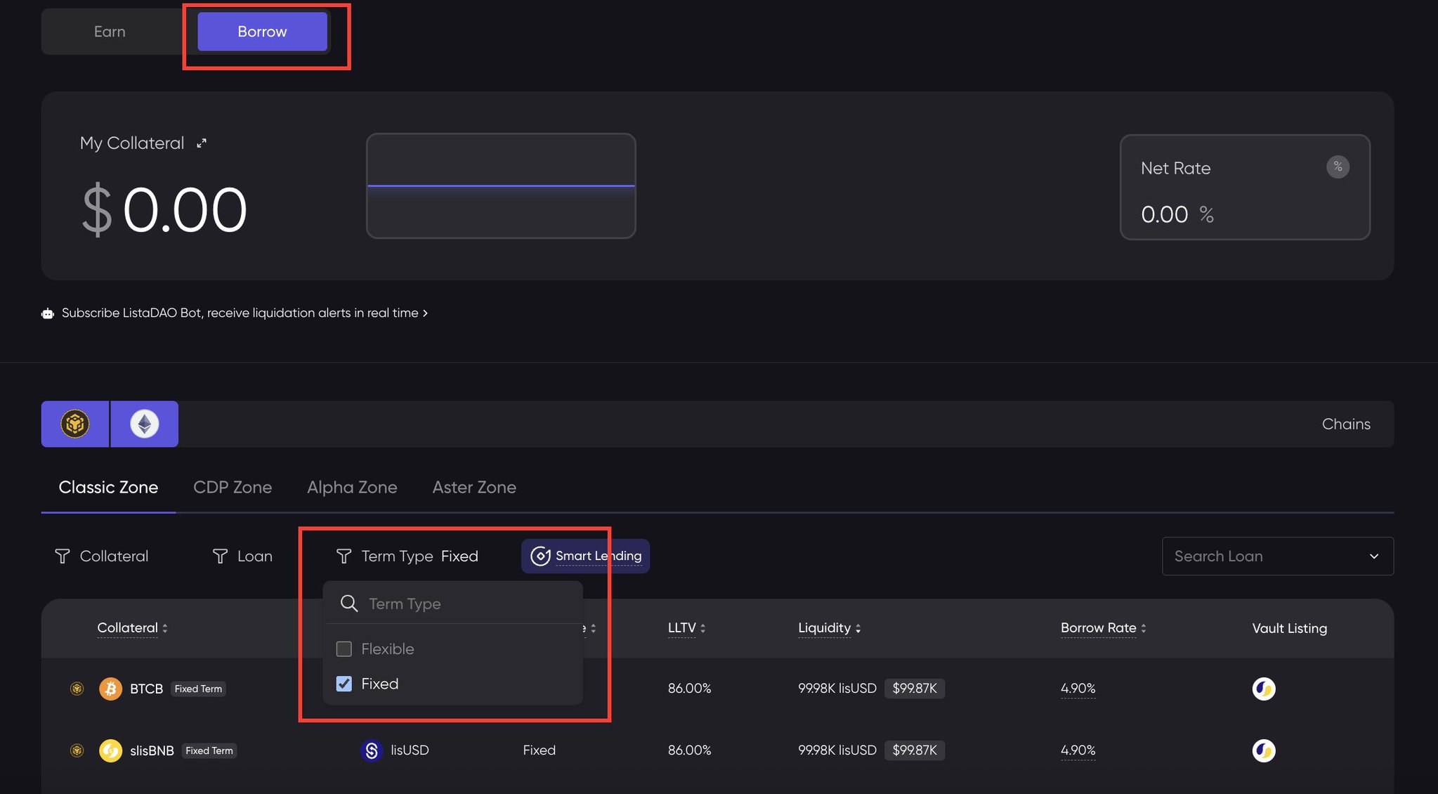Currently, it only supports collateral of BTCB, slisBNB, and BNB, issuing lisUSD at a fixed term and fixed interest rate.
