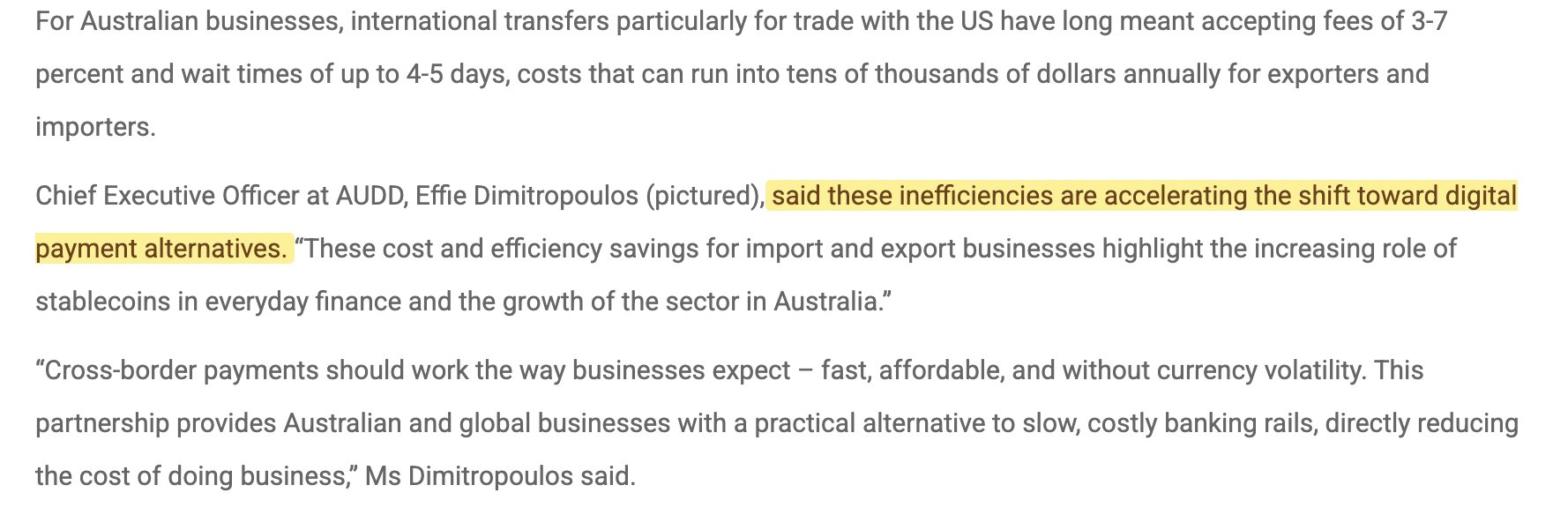 The pain point is real: AU↔US business transfers can mean multi‑day settlement + meaningful fees. That’s exactly why firms look for digital payment alternatives.
