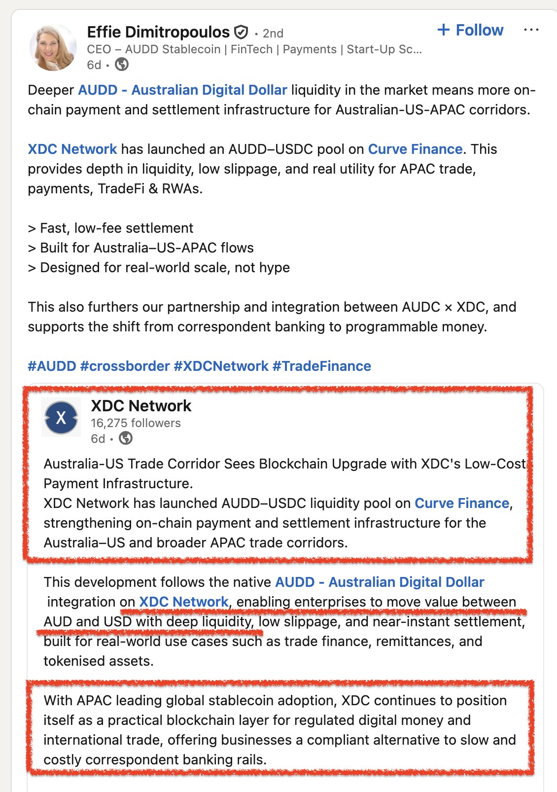 🧵 AUDD is building both liquidity and rails: XDC/Curve + Hedera/Acacia 🇦🇺
