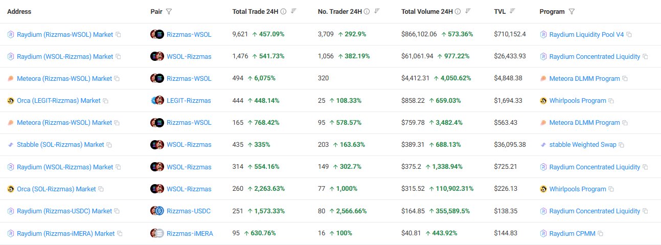 Rizzmas experiences explosive growth in volume and price on Solana DEXes, indicating strong accumulation momentum.