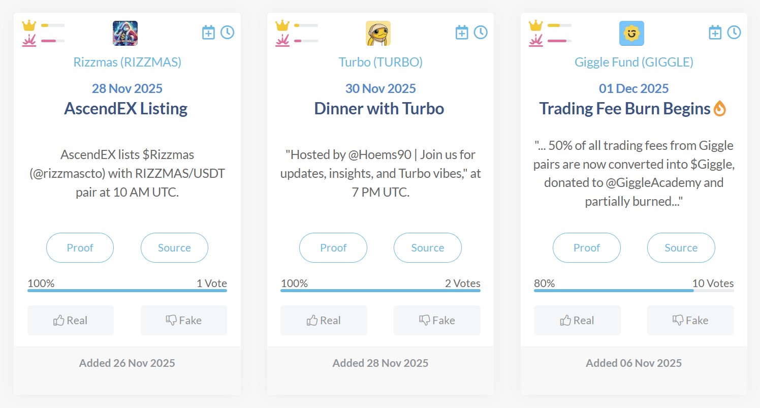 CoinMarketCal previews upcoming events for RIZZMAS, TURBO, and GIGGLE meme tokens.
