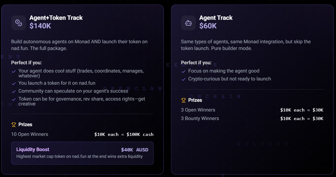 Monad가 Moltiverse 해커톤을 개최하며, 20만 달러 규모의 상금을 제공하고 AI 에이전트와 토큰 발행에 초점을 맞추고 있습니다.