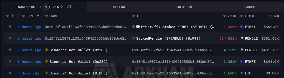 6시간 전, 이 거대한 물고기가 #Binance에서 1.36M $ETHFI (~$645k)와 334.5k $PENDLE (~$492k)을 인출하고 모두 스테이킹했습니다.