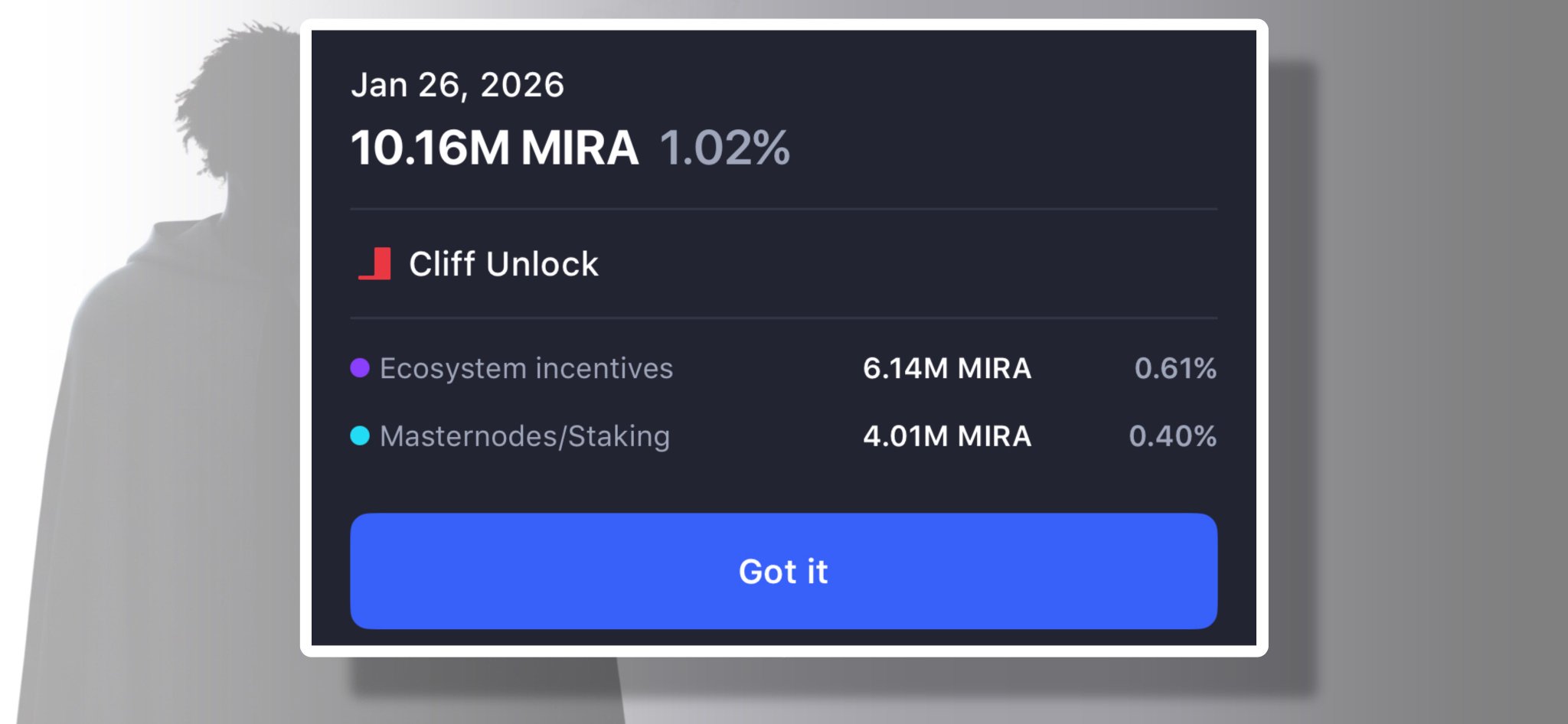 MIRA 토큰이 오늘 총 공급량의 1.02%인 10.2M 토큰을 해제합니다.