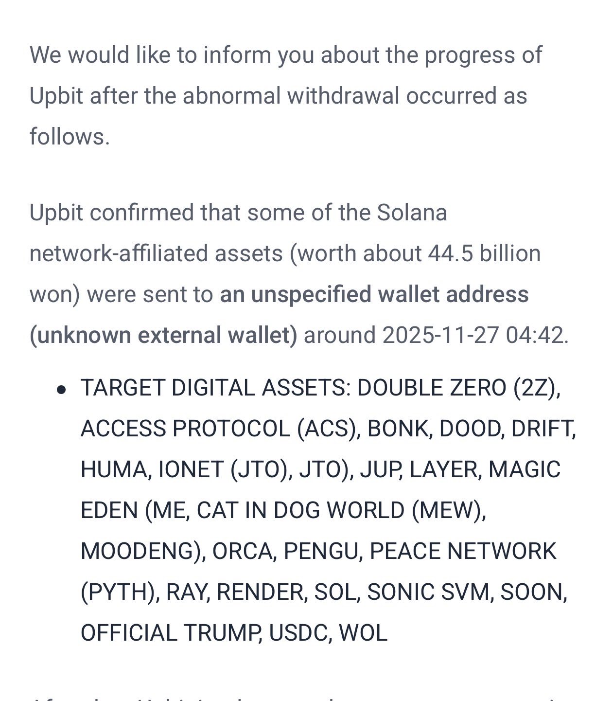 At around 04:42 on November 27, 2025, Upbit detected suspicious transfers in which a portion of Solana-network assets (approximately KRW 54 billion) was sent to wallet addresses not designated by the exchange (unknown external wallets).