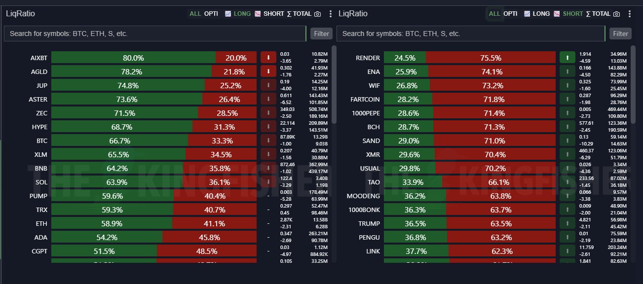 It can be said that coins such as Aixbt, agld, jup, aster, zec have relatively high long ratios, indicating potential risk.