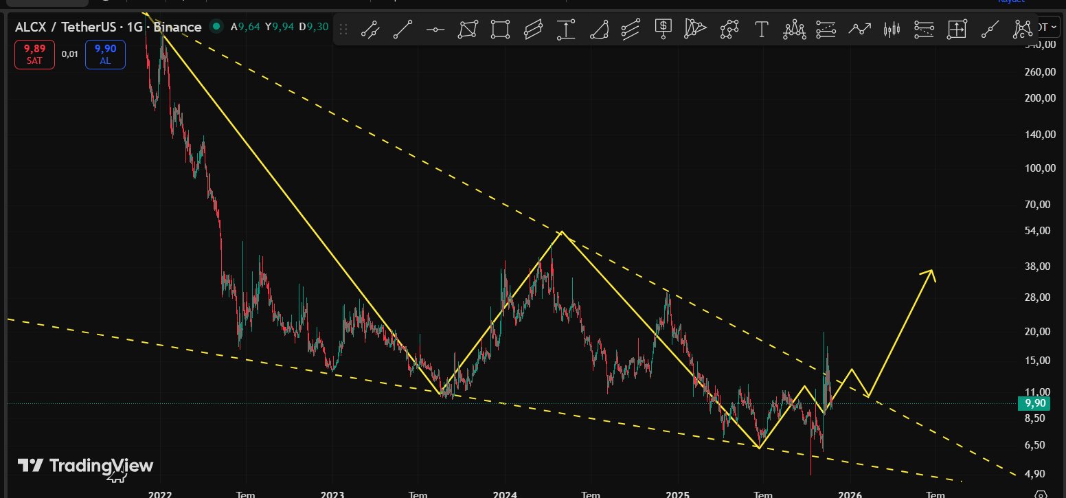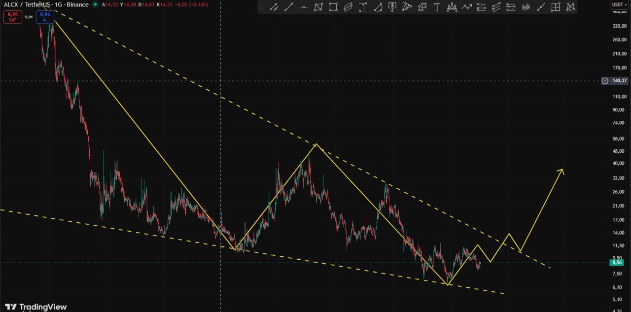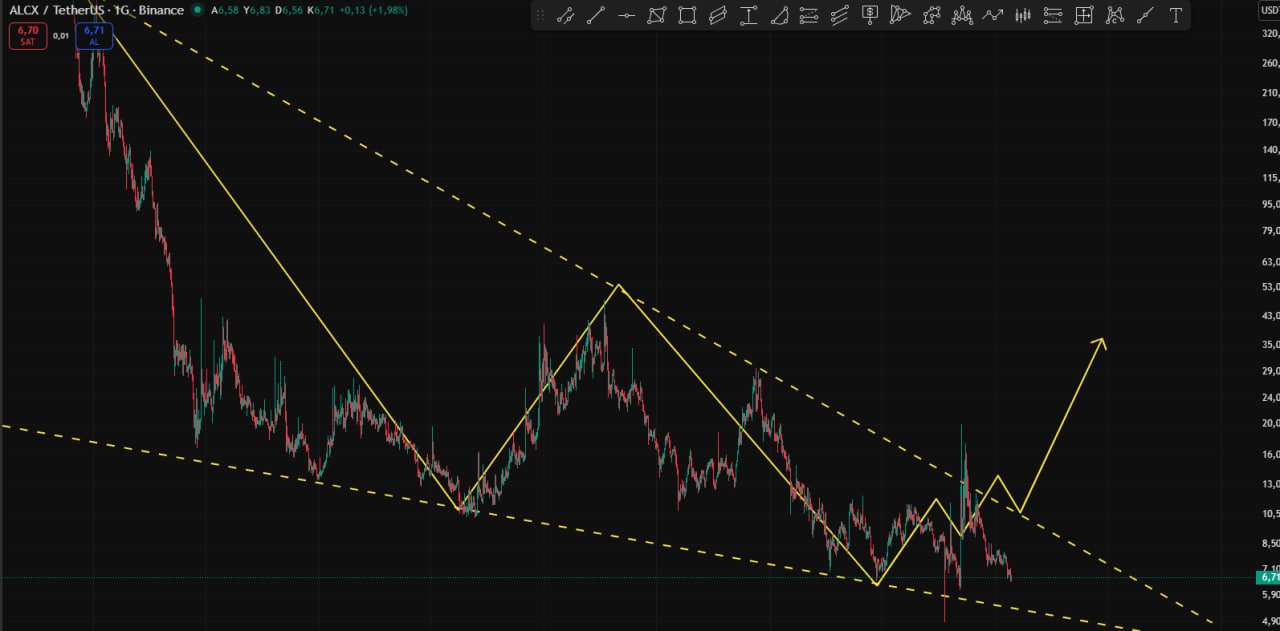 ALCX back in the demand zone, chart shows potential to break the long‑term downtrend channel and surge.