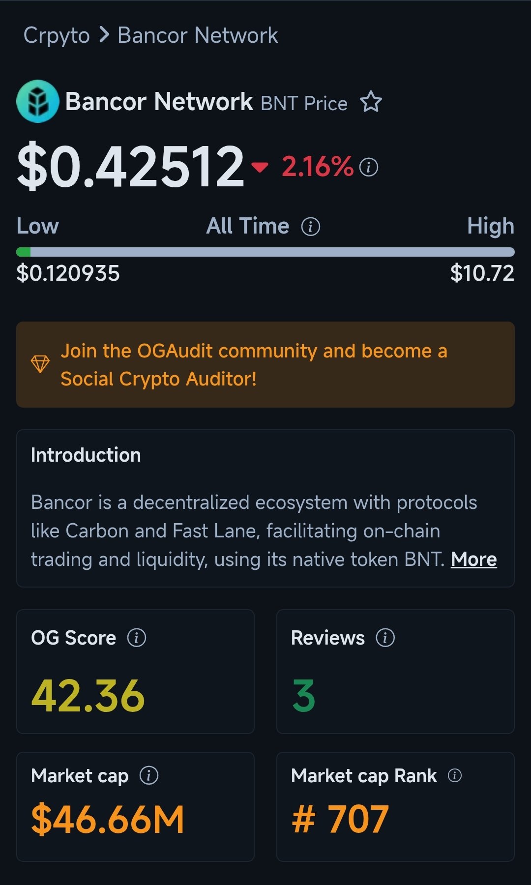 OGAudit introduces Bancor, a decentralized exchange, with a slight dip in BNT price.
