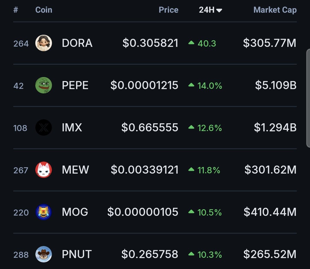 The best performing tokens in the past 24h are memecoins.