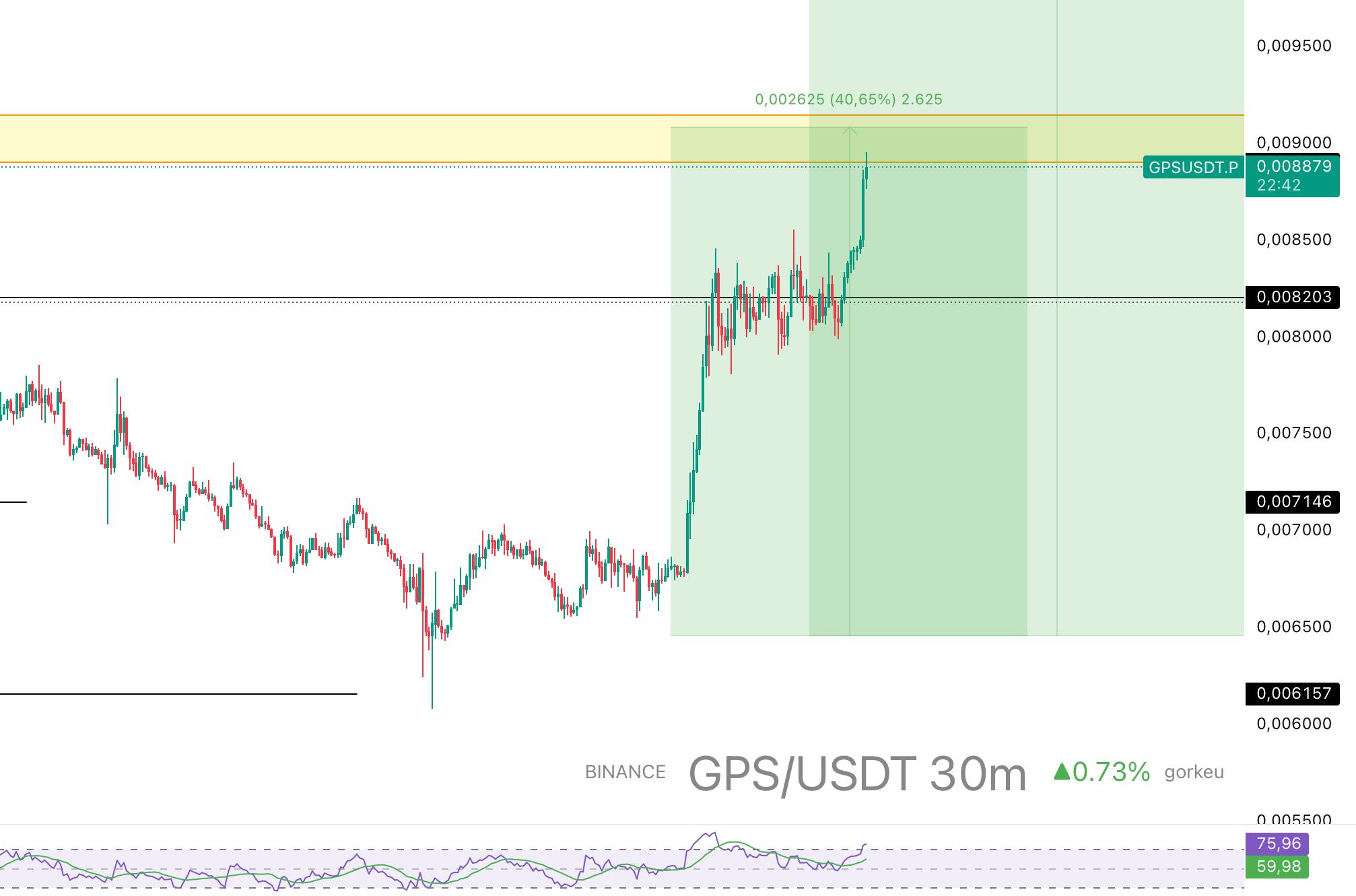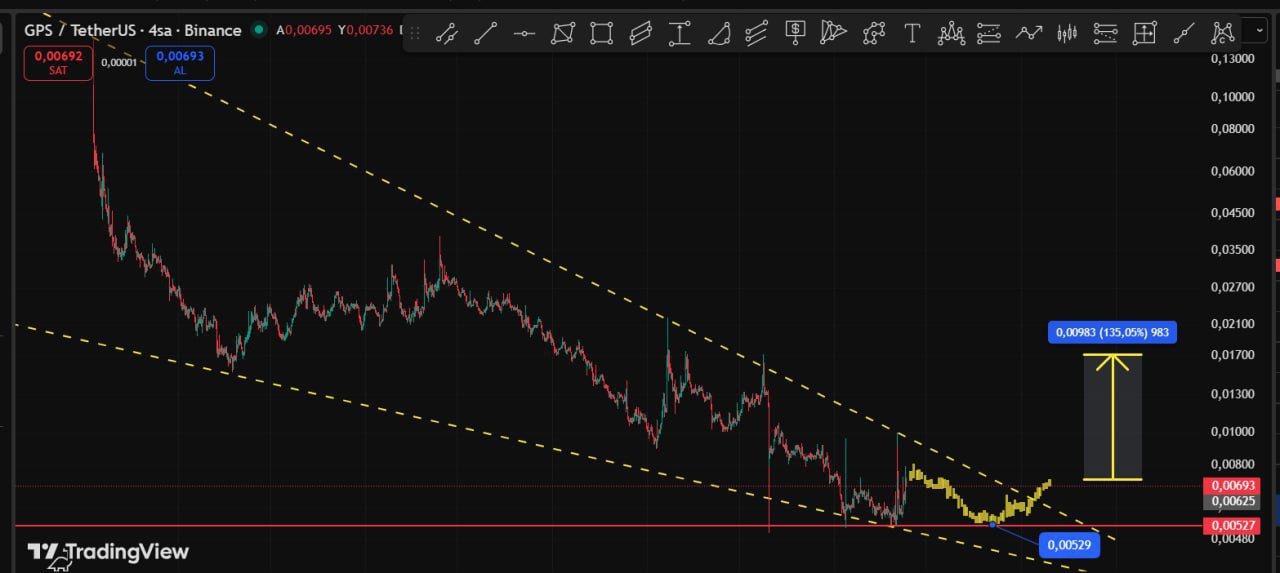 GPS breaks out of the long-term downtrend and now faces resistance at $0.0095‑$0.010, but the target is progressing well.
