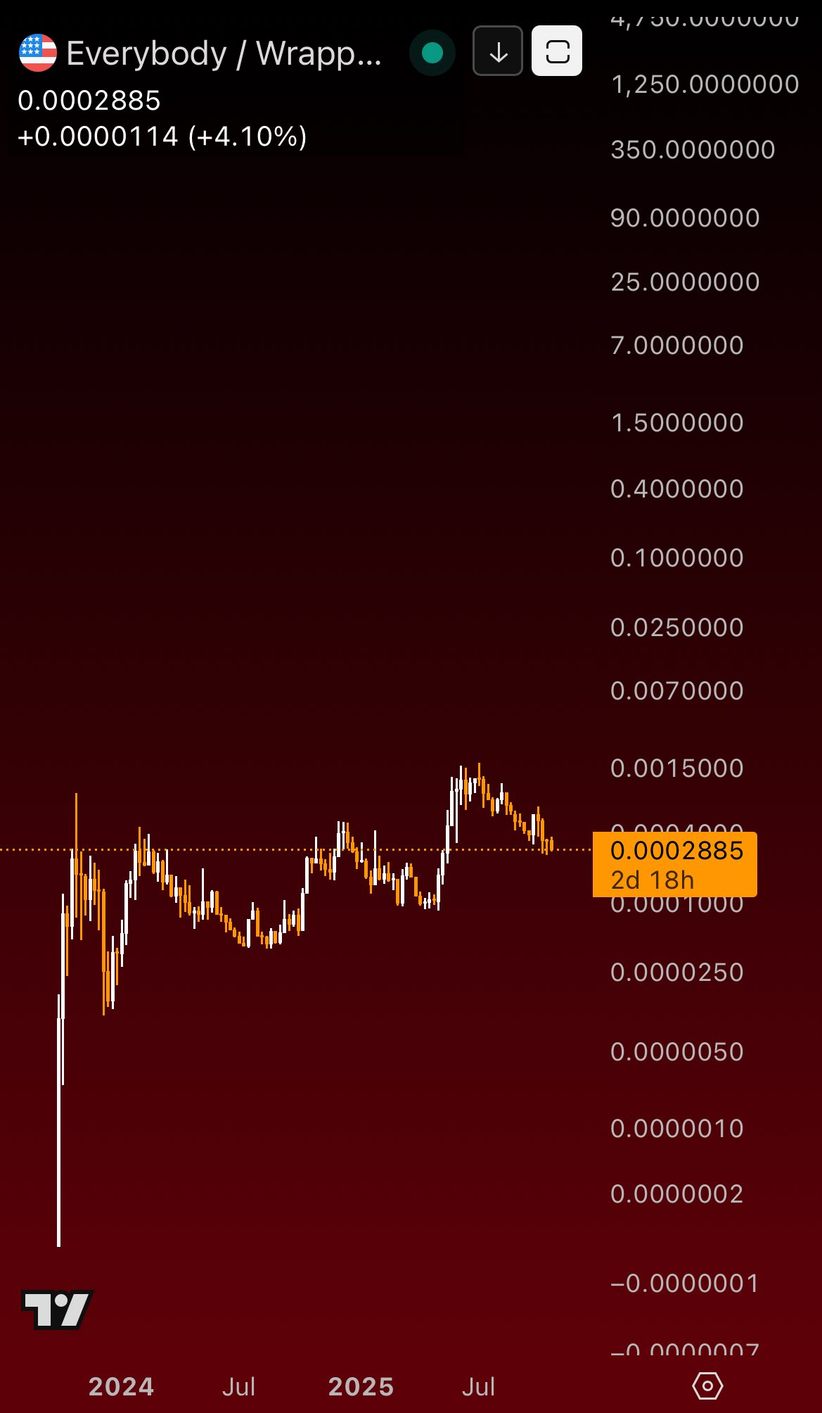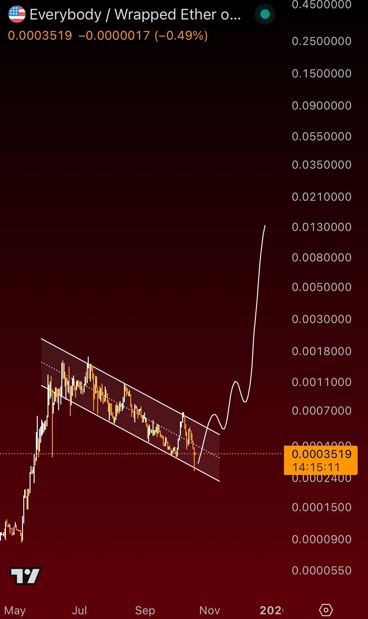 The tweet and chart indicate that $HOLD (Everybody/WETH) has bottomed out and broken through the descending channel, signaling a significant price increase.