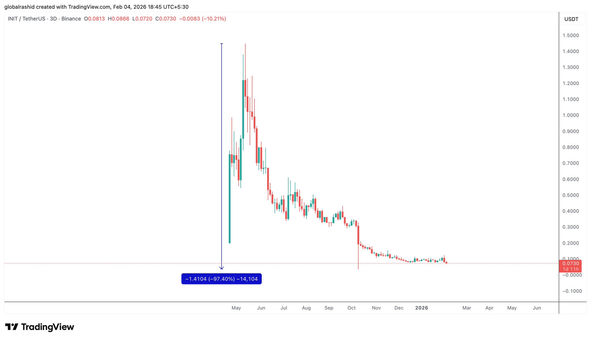 INIT price is extremely bearish, down 97.4% with no sign of recovery.