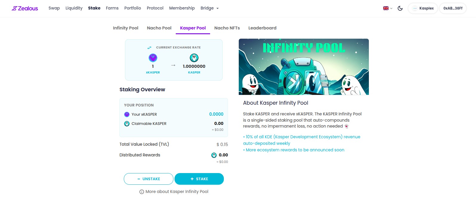 The KASPER Infinity Pool is now live on Zealous Swap, offering ecosystem earnings and automatic compound staking.