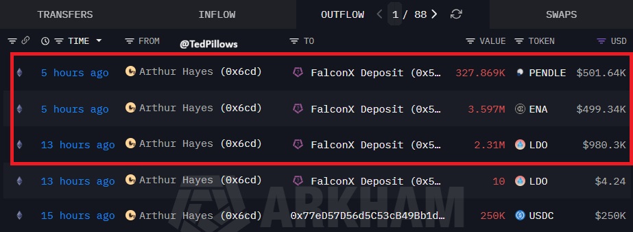 Arthur Hayes is moving PENDLE, ENA, and LDO to exchanges, indicating potential selling pressure.