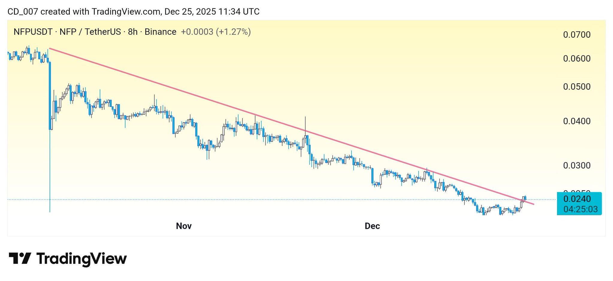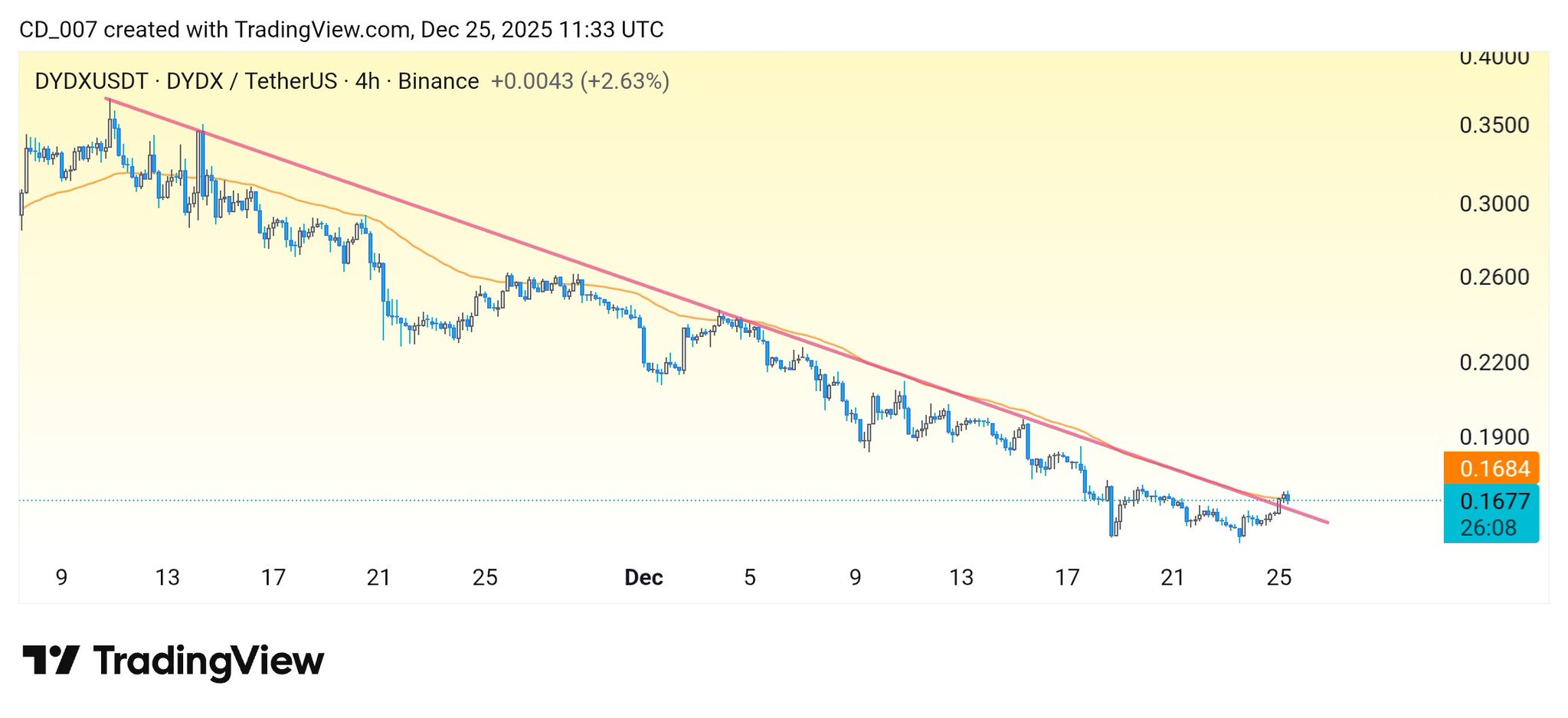 DYDX and NFP are being watched, charts show a potential breakout of the downtrend.
