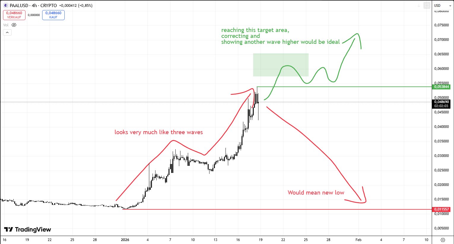 What would be ideal if it reached the 🟢 target area, corrects mostly sideways for a couple of days and then makes another high.