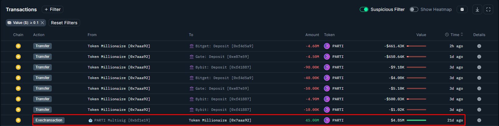 PARTI token has heavily flowed out from a team‑related wallet to exchanges, reaching $1.4M in the past 3 days.