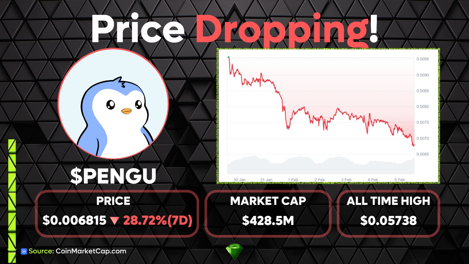 The price is dropping for @PudgyPenguins this week! With a price decline of over 30% in the last 7 days, $PENGU has dropped due to a broader market sell-off this week and memecoin pressure in the market!