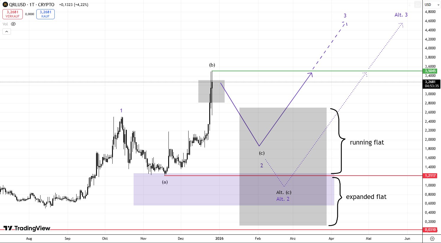 There still is the possibility of Alt. 2🟣, but since #QRL already shot above the Wave- (b)⚫️ target area, it seems unlikely. Since volume is super low, I think it still could be correct in case, it slows down today and leaves a big wick.