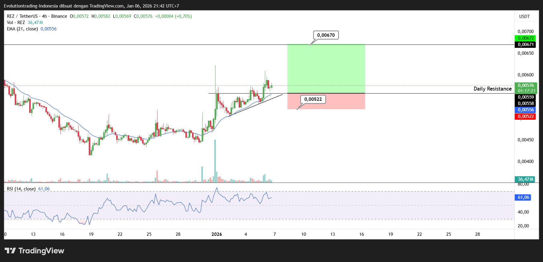 REZ shows a potential bullish trading opportunity, target price 0.00670, risk management required.