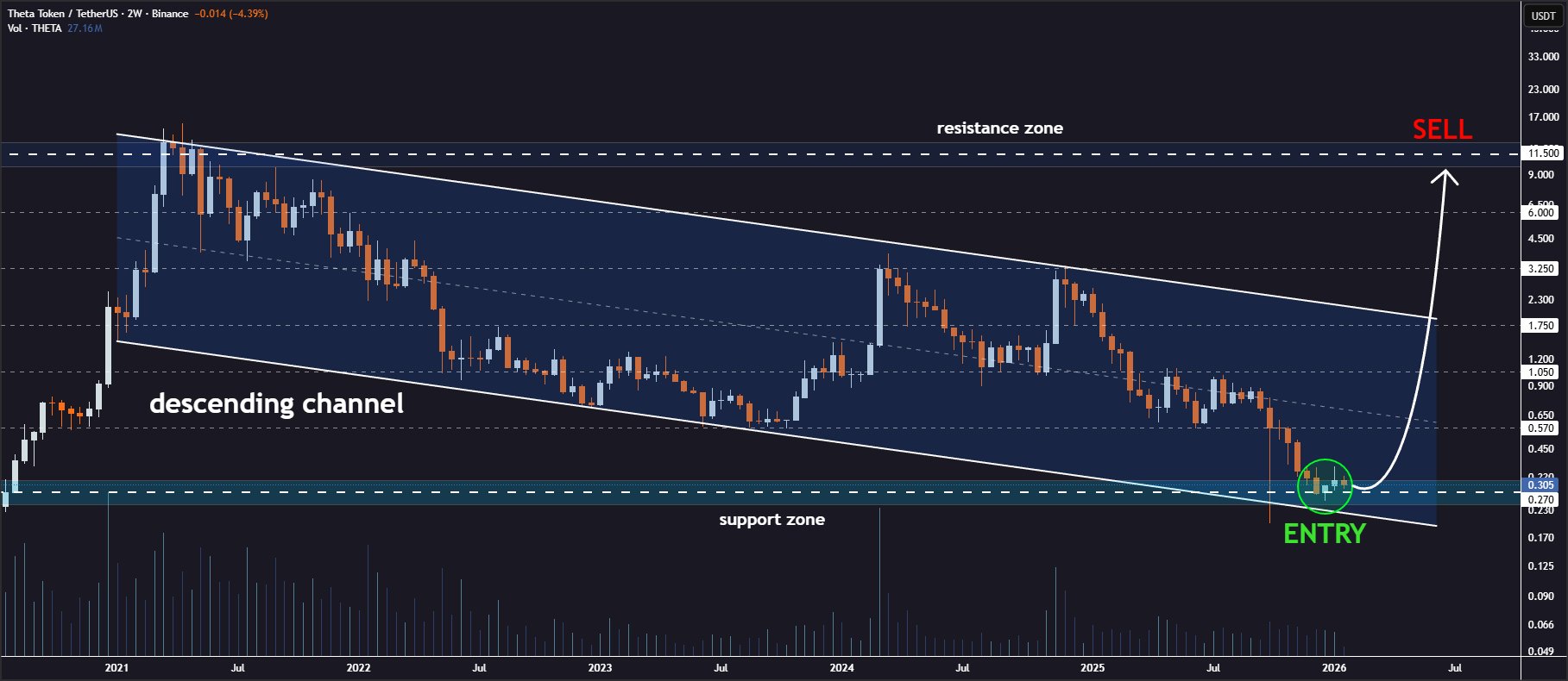 Theta is bouncing from the lower border of the descending channel formation on the 2-week chart🔍