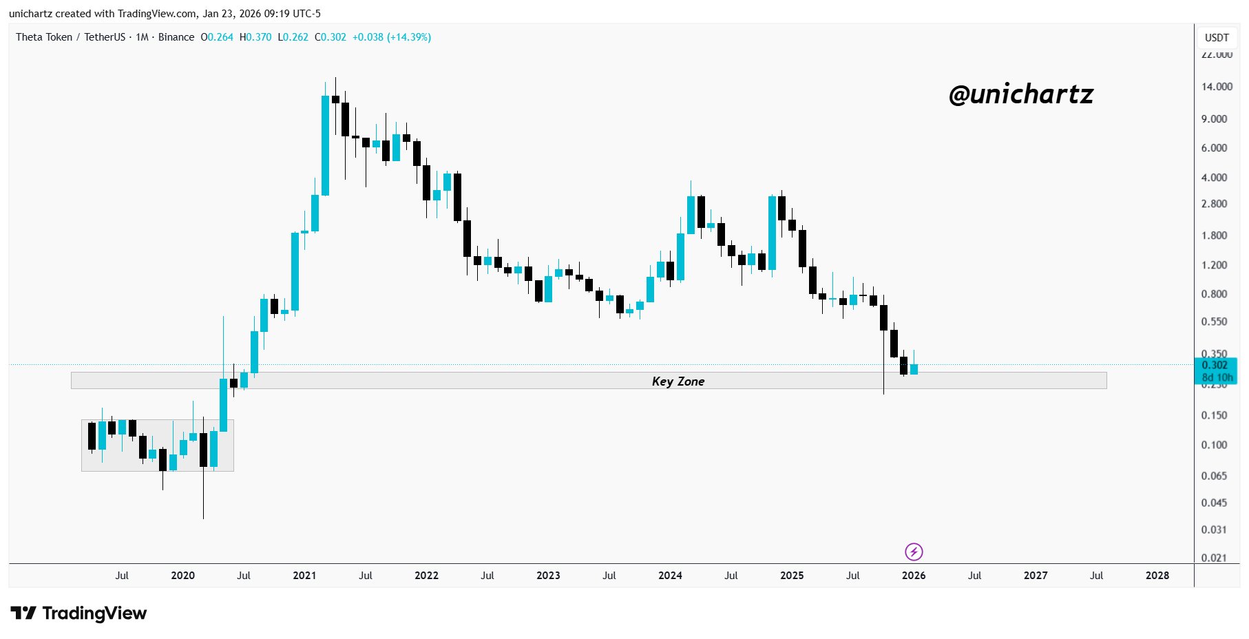 THETA price is in a key support area, the technical chart shows potential rebound signs.