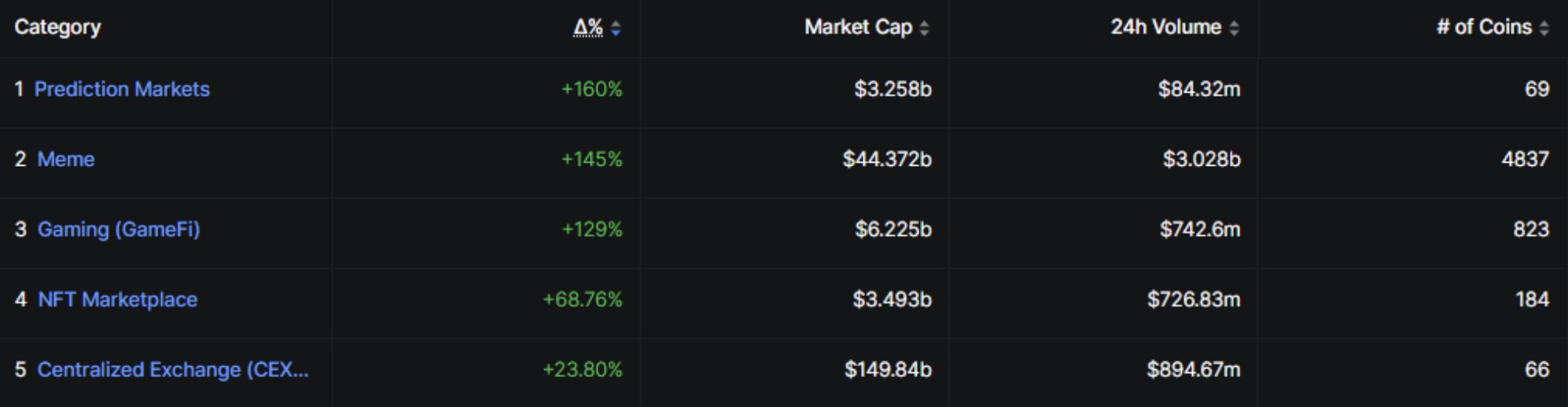 🔹 Web3 gaming ranked 3rd on @DefiLlama's narrative tracker, trailing prediction markets and meme coins