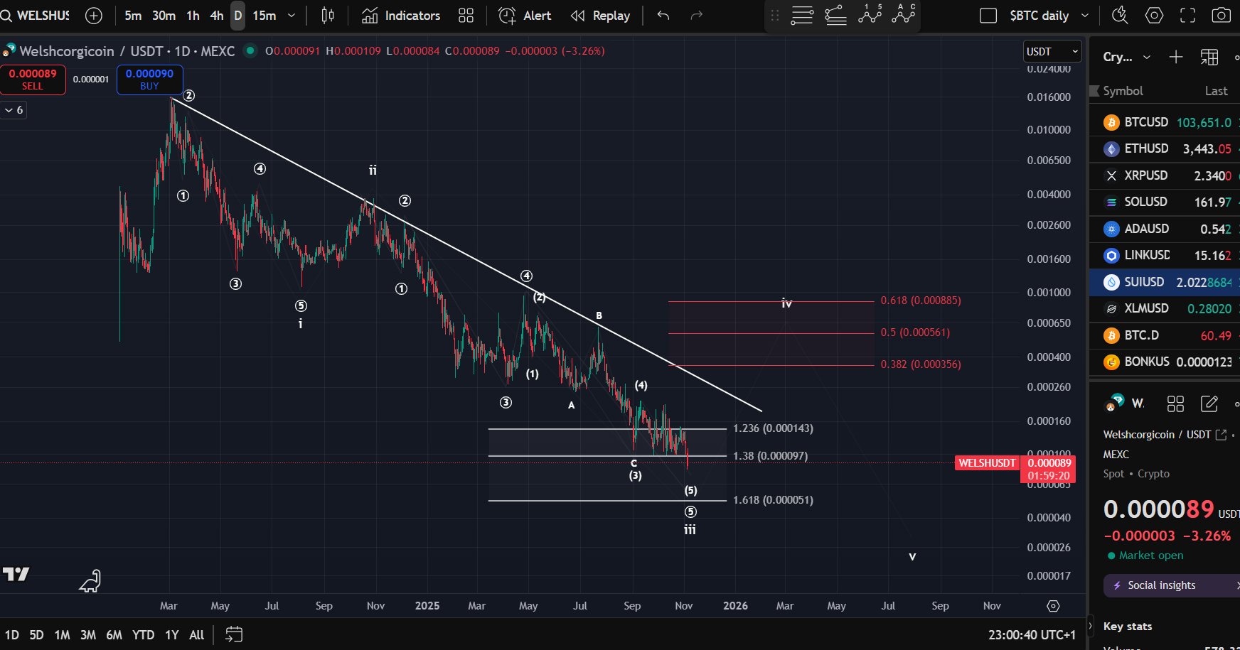 $WELSH: The chart remains bearish, and investing here would carry significant risk. Since my last update in July 2025, price has closely followed the predicted downward roadmap. It has already broken below the 1.38 Fib level, with a potential target at the 1.618 Fib level around $0.000051. Resistance for a wave-iv high is between $0.000356 and $0.000885.
