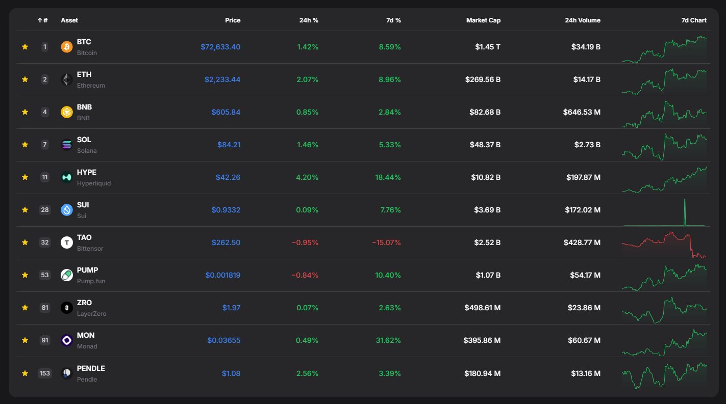 My watchlist for the next season $BTC, $ETH, $BNB, $SOL, $HYPE, $SUI $PUMP, $MON, $ZRO, $TAO, $PENDLE Agree or not, up to you. Bottom? We might still get another 50% discount, who knows. I'm not calling it. Just DCA and survive. https://t.co/RmAoMUR0t4