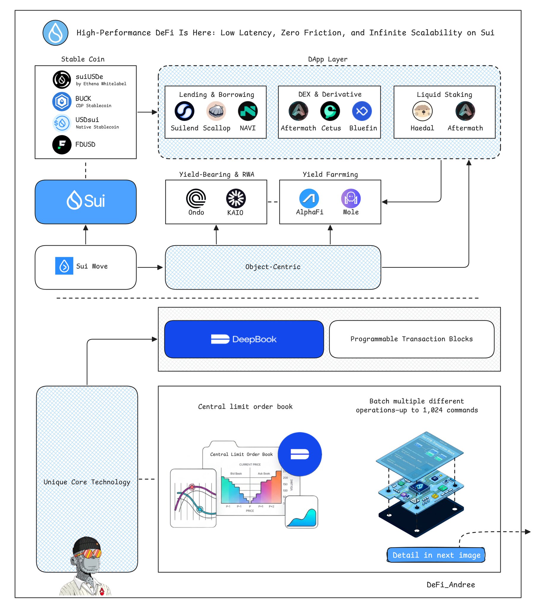 High-Performance DeFi Is Here: Low Latency, Zero Friction, and Infinite Scalability on @SuiNetwork The Sui blockchain is rapidly establishing its position as one of the high-performance platforms for DeFi Low latency, infinite scalability, and low transaction fees Let's break it down ↓↓↓ --- Core Technology Foundation - Object-Centric and Move Sui Move and the Object-Centric model create a unique foundation. Instead of using an Account-based ledger model like Ethereum where every transaction must update the global state. Sui treats every asset (tokens, NFTs, LP positions) as an independent object DApp Layer provides a full suite of core DeFi services: ▸ Lending & Borrowing: @suilendprotocol, @Scallop_io, @navi_protocol ▸ DEX & Derivatives: @AftermathFi, @CetusProtocol, @bluefinapp ▸ Stablecoins: Expanding aggressively with $suiUSDe, $BUCK, $FUSD, etc. ▸ Liquid Staking: @HaedalProtocol, @AftermathFi ▸ Yield-Bearing & RWA: @KAIO_xyz, @OndoFinance ▸ Automated Yield Farming: @AlphaFiSUI, @moledefi ---