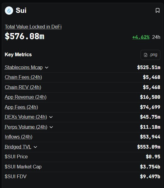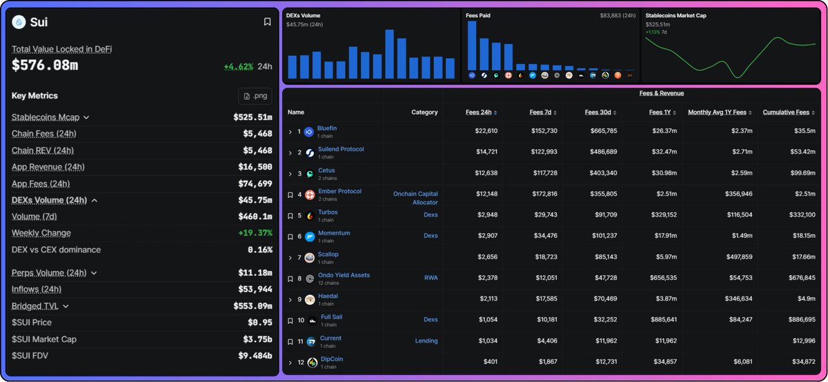 $111 billion in stablecoin volume processed in a single month. On a chain with a $3.74b market cap 📊 That ratio isn't normal, and even though the data is from Q1 2026, it was enough to make me sit down and spend 2 hours going back through Sui's numbers properly. What I found doesn't match the bearish sentiment on @SuiNetwork rn. – TVL: ~$576M, down significantly from the $2.2B peak in mid-2025 – Stablecoin supply onchain: $525M, ~92% of total TVL – DEX volume: $460M over 7 days, +~20% WoW – App fees: $75K/day. Chain-level fees: only $5.5K – This week: fees +53%, TVL +7% When fees grow faster than TVL, the existing capital onchain is being used more actively, not sitting idle. The wide gap between app fees and chain-level fees (what validators actually receive) tells you the ecosystem is generating real revenue well above the base layer. Protocol composition backs this up. Top fee earners right now are @bluefinapp (perps), @suilendprotocol (lending), and @CetusProtocol (AMM) – a reasonably mature DeFi stack where derivatives, lending, and spot trading are all generating consistent revenue. Additionally, a stablecoin mcap/TVL ratio of ~92% makes Sui look like an L1 where users are actually holding stable assets, moving them, and using them for lending, payments, and trading. The clearest evidence of this is DAAs up 83% YoY, with 382m transactions in Q1 2026. But to be objective, that number isn't close to Solana's 25.3b transactions over the same period. Sui is not winning the throughput war against Solana. That gap is real, and it matters for developer distribution and application diversity over time. What they're building at the institutional layer, though, is a different conversation 👇 Just in April: > USDsui, the chain's native stablecoin, was issued by Bridge – a Stripe company. Stripe's payment infrastructure being deployed to issue the native stablecoin of an L1 is a clear signal of what Sui is actually being built for: programmable, native onchain payments with #TradFi distribution infra behind it. > CME Group is launching SUI futures on May 4, 2026 – both standard and micro contracts. This matters because it creates a regulated hedging instrument for institutional allocators who can't or won't hold spot crypto. Icymi, over $300 million is already deployed in Sui-based ETPs across Grayscale, VanEck, and Franklin Templeton. > Hashi – a decentralized Bitcoin collateral primitive – also launched on devnet in March with support from over 20 institutions (BitGo, FalconX, Bullish, Ledger, etc.), allowing native BTC to serve as programmable collateral for lending and credit markets on Sui without wrapping or custodians. Zooming out, what I see is a chain being built as a high-value settlement layer – positioning for institutional stablecoin flows, regulated derivatives, and object-centric applications that the Move programming model is specifically designed to enable. Opportunity often comes from contradictions. With $SUI, the risk is still there. Price action has been weak while fundamentals are quietly improving, but the onchain data isn't telling the same story as the price. That divergence is where things get interesting. NFA + DYOR 🤝