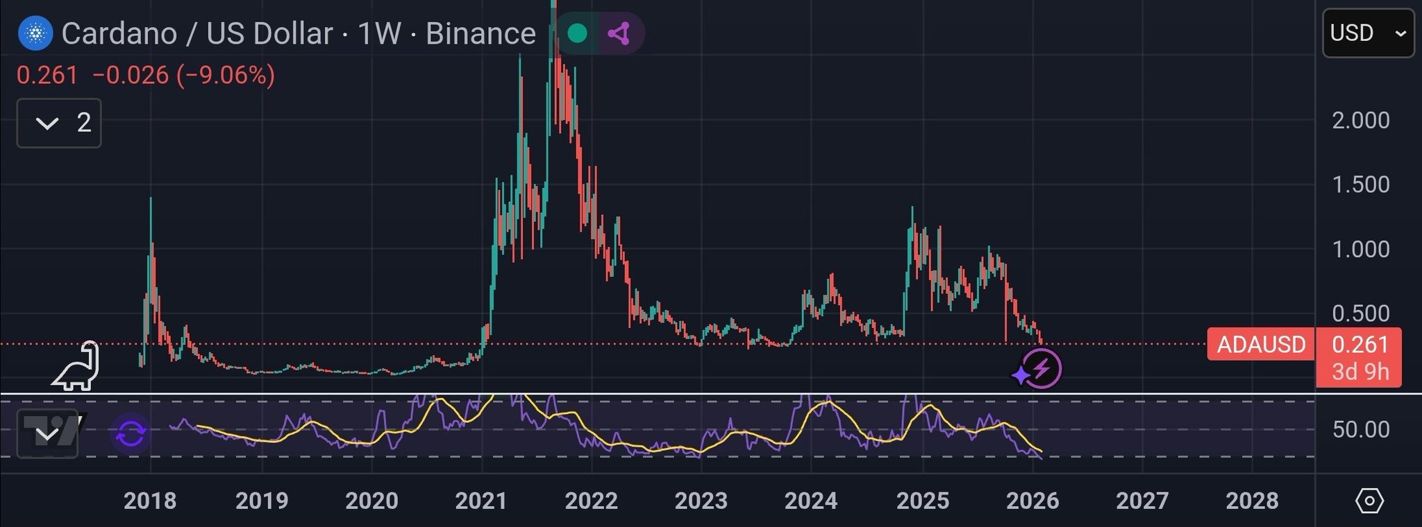 The ADA weekly chart shows it is in a historic oversold state, indicating a potential rebound opportunity.