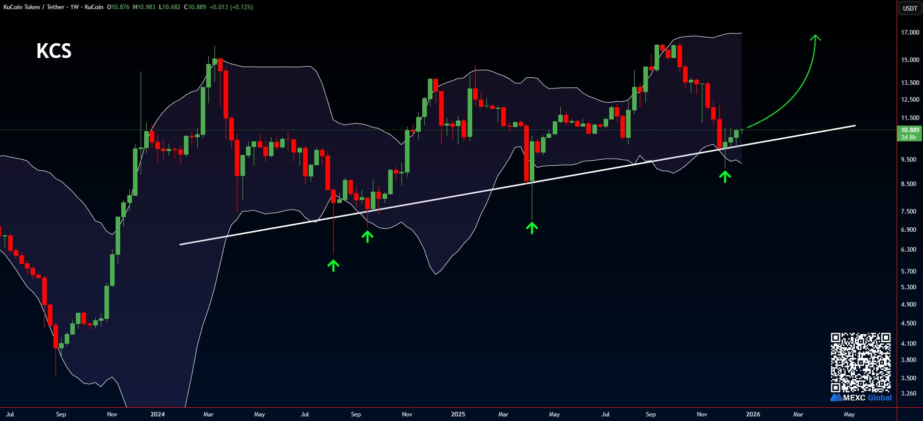 KCS hits the ascending support line and the lower Bollinger Band, expected to rebound upward.