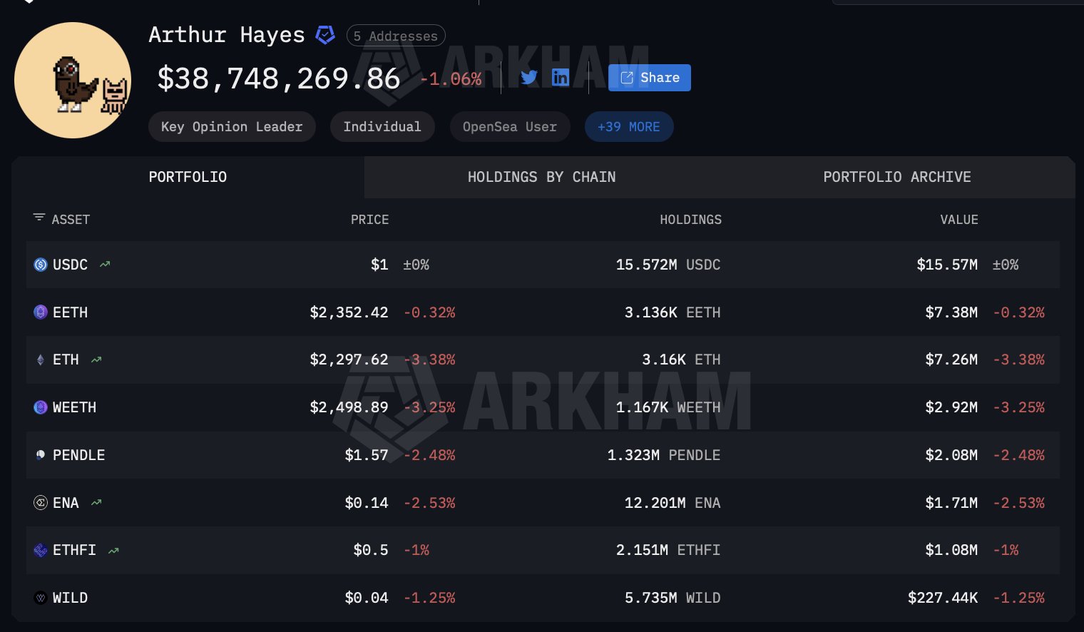 Despite these Losses, Hayes’ Portfolio is Currently Valued at Around $39M, with $15.57M held in $USDC