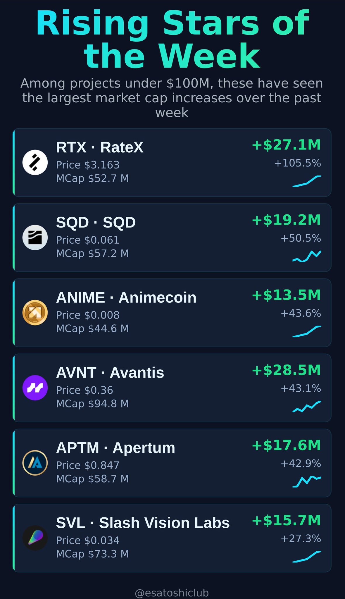 Small‑cap coins like RTX saw strong growth this week, with RTX up over 100%.