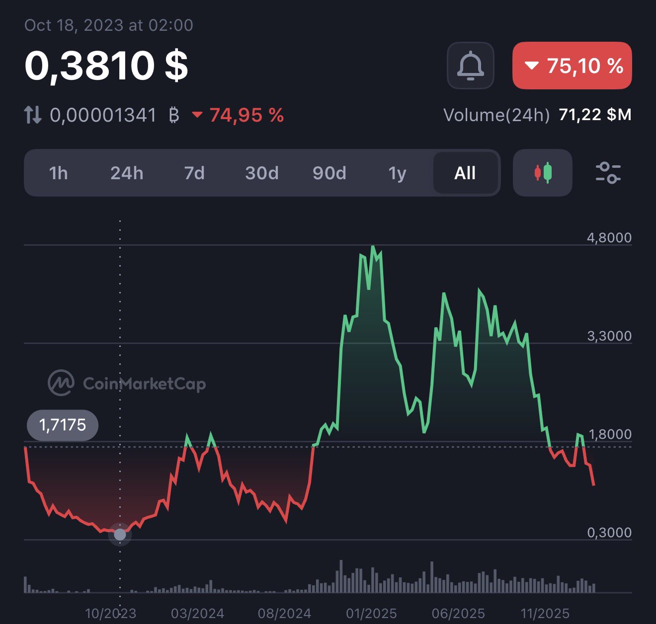 SUI has dropped to $0.3810, a decline of over 75%, and the tweet discusses how to respond if it falls below $1.