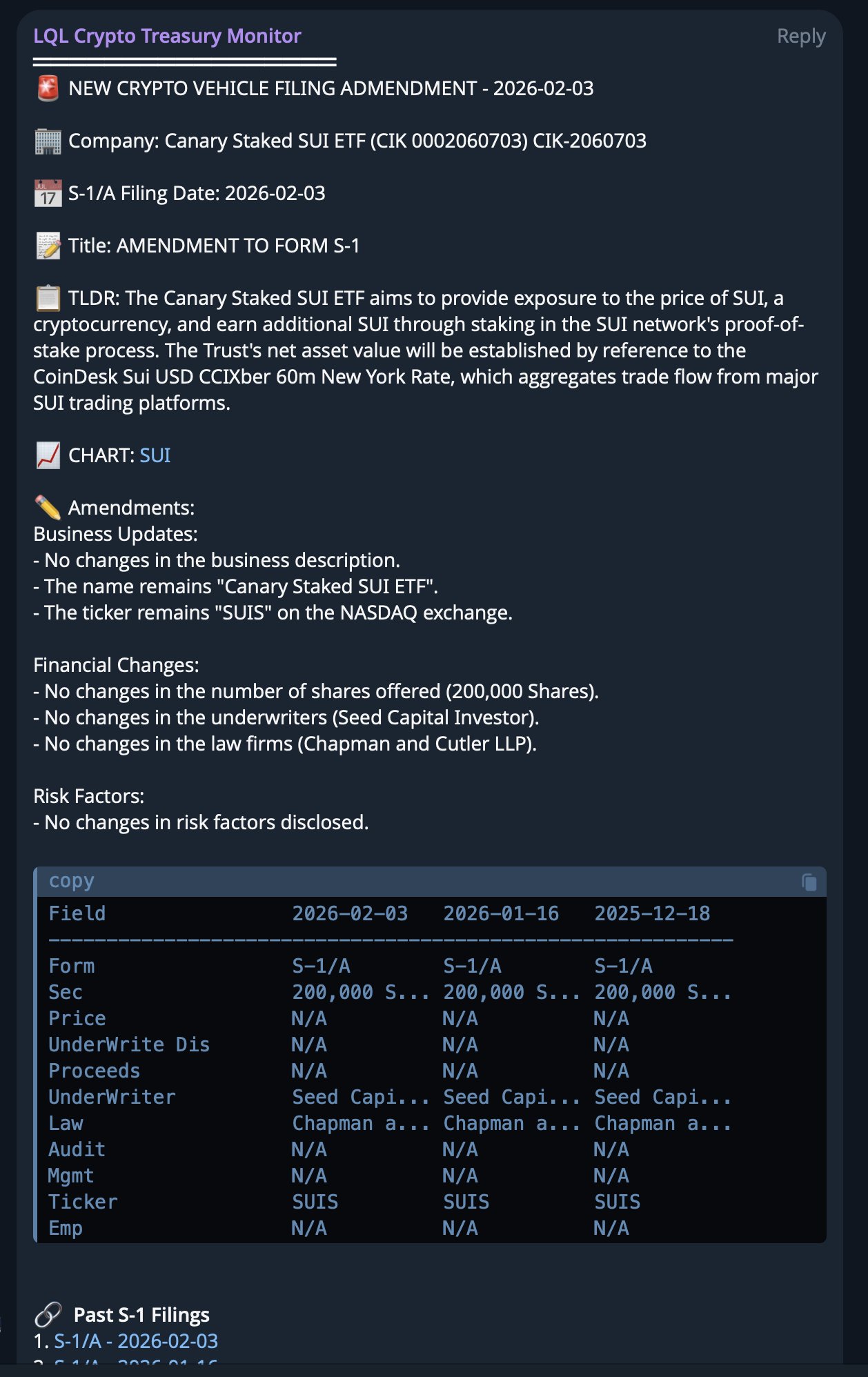 SUI ETF News: @CanaryFunds files ammendment to their SUI Staking ETF S-1/A includes changes:
