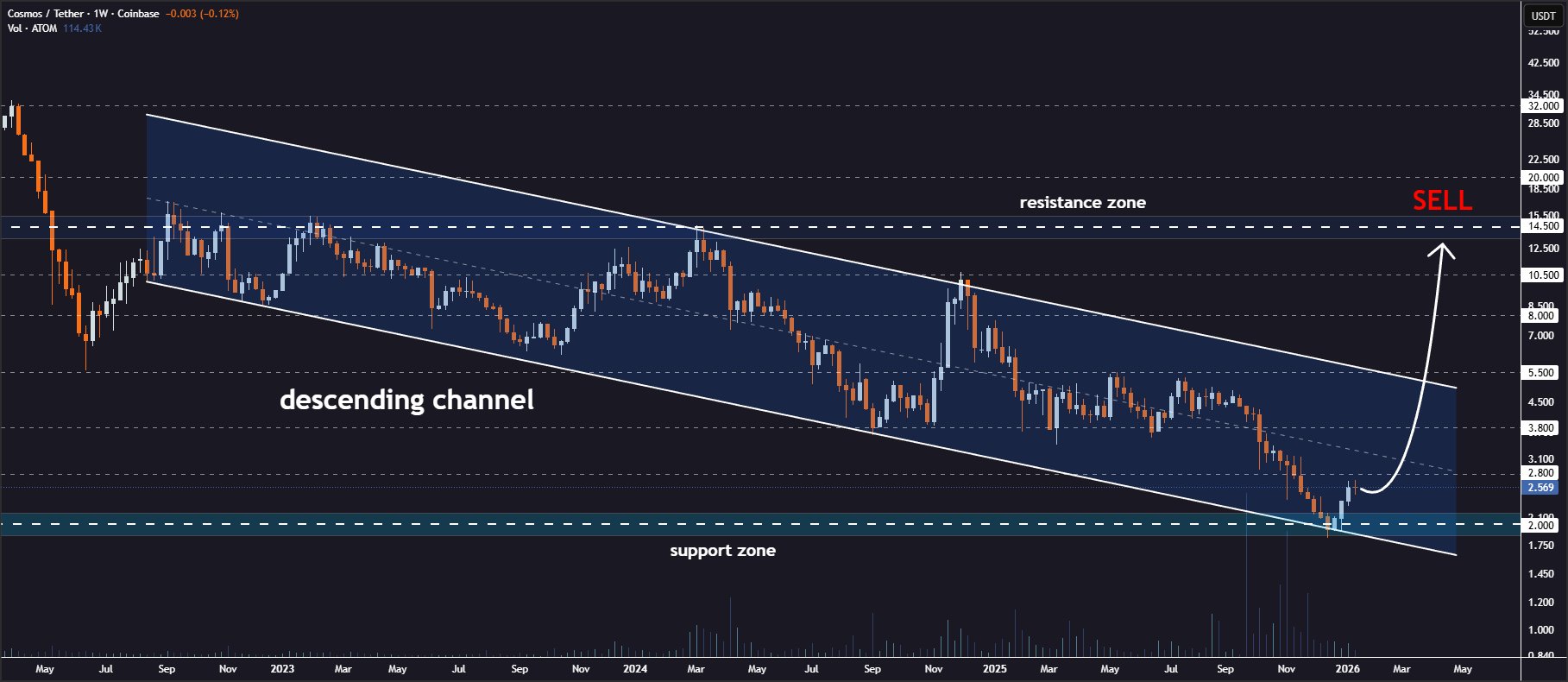 Jonathan Carter TA_Analyst Influencer B8.39K @JohncyCrypto#ATOM Descending Channel Support Bounce🧐 Cosmos is bouncing from the lower boundary of a descending channel formation on the weekly timeframe👀 Price action is holding above this key support zone, which could serve as a strong foundation for a reversal💁♂️ Target levels: 🎯 $2.80 🎯 $5.50 🎯 $8.00 🎯 $10.50 🎯 $14.50