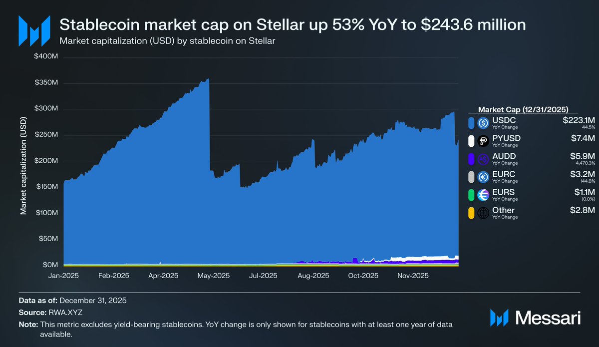 Matt Kreiser D1.07K @KreiserMatt@StellarOrg Financial Ecosystem Update, what you need to know: - In December, the Marshall Islands completed the world’s first onchain universal basic income disbursement by a national government on Stellar. - @usbank is testing custom issuance of its own stablecoin on Stellar, underscoring the network’s institutional appeal due to its reliability (>99.99% uptime), affordability (settlement at <$0.01 USD), and built-in asset controls for regulatory compliance. - Stellar’s stablecoin market cap increased 53% year-over-year from $159 million to $243.6 million, driven by @PayPal's PYUSD launch on the network in September, and USDC’s 45% YoY increase in market cap to $223.1 million.