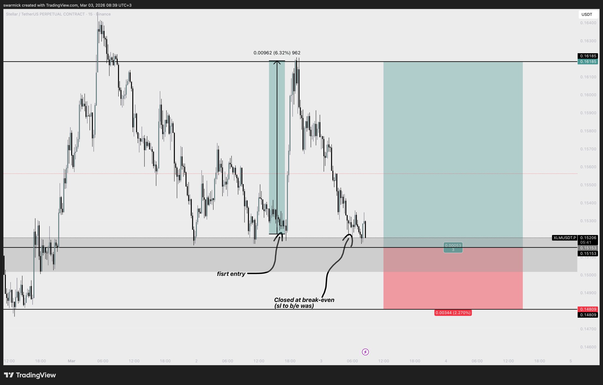 $XLM enjoooooy has risen by almost 7% since the entry point, BUT I only took part (40% volume) of the profit and it closed at break-even while I was sleeping I set a new limit order at the point where other people's stop losses (liquidity) will be triggered Tp 0.16159, Sl 0.1409, Entry 0.15153