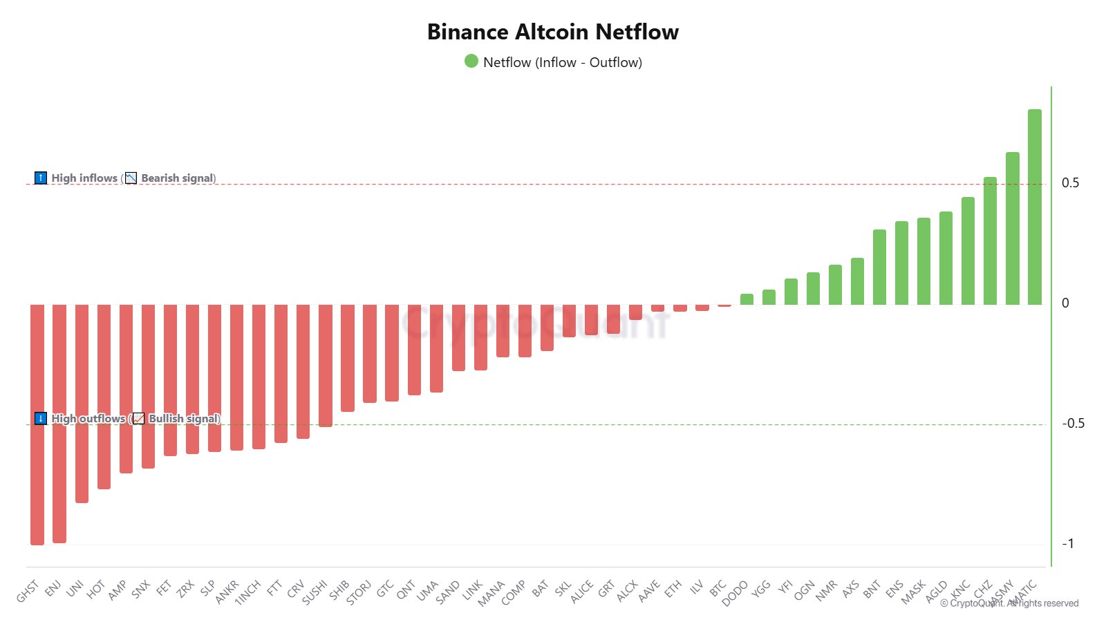 Coins saw outflows from Binance include $GHST, $ENJ, $UNI, $HOT, $AMP, $SNX, $FET, $ZRX, $SLP, $ANKR, $1INCH, $FTT, $CRV, and $SUSHI. Outflows from the exchange are a signal of accumulation.