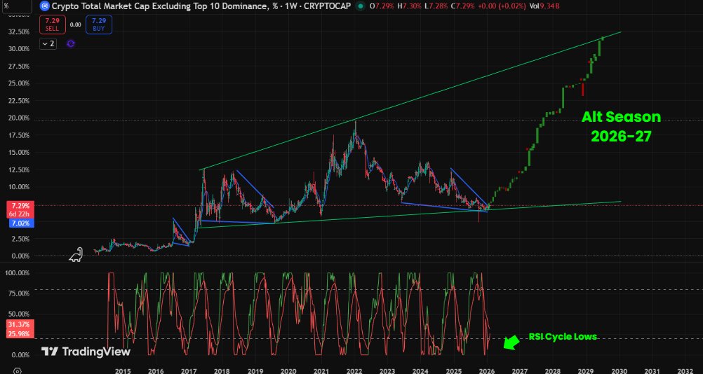 Expect a crazy altcoin season in 2026-27, with RSI at cycle lows.