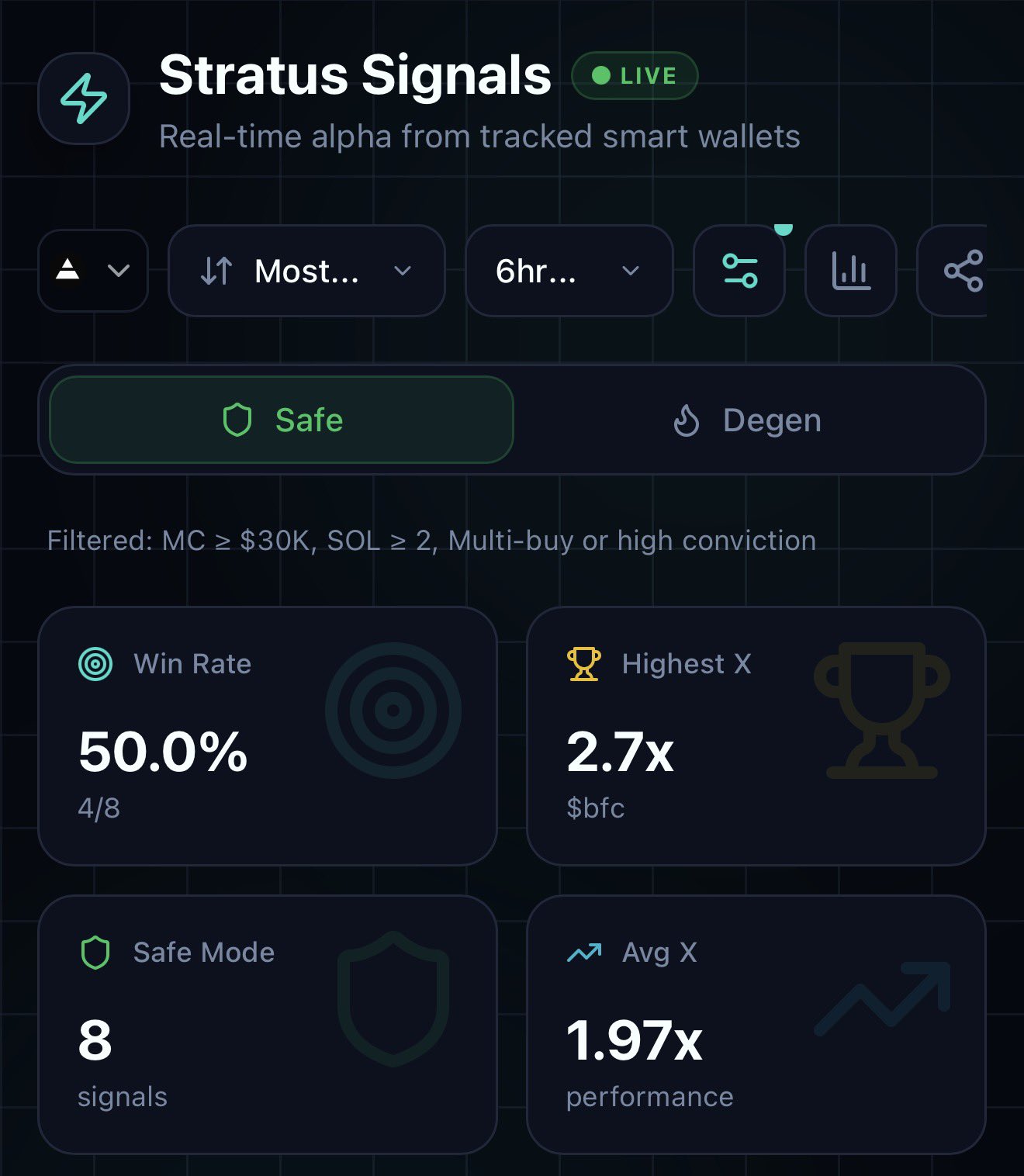 Stratus Signals product update, showcasing its signal service’s ability to identify tokens that deliver up to 13x returns.