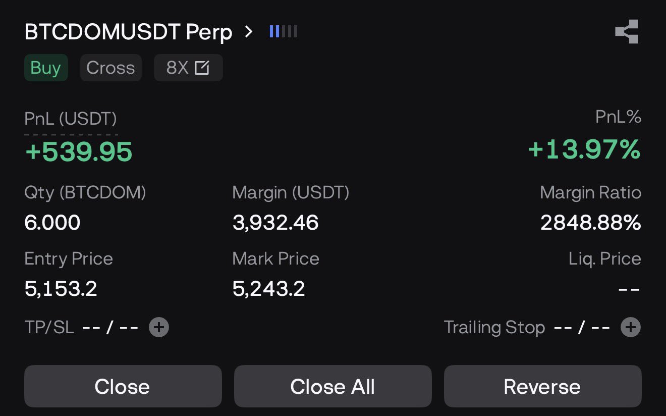 The author is long BTCDOM and making profit, believing it will break new highs, indicating that altcoins will face a decline.