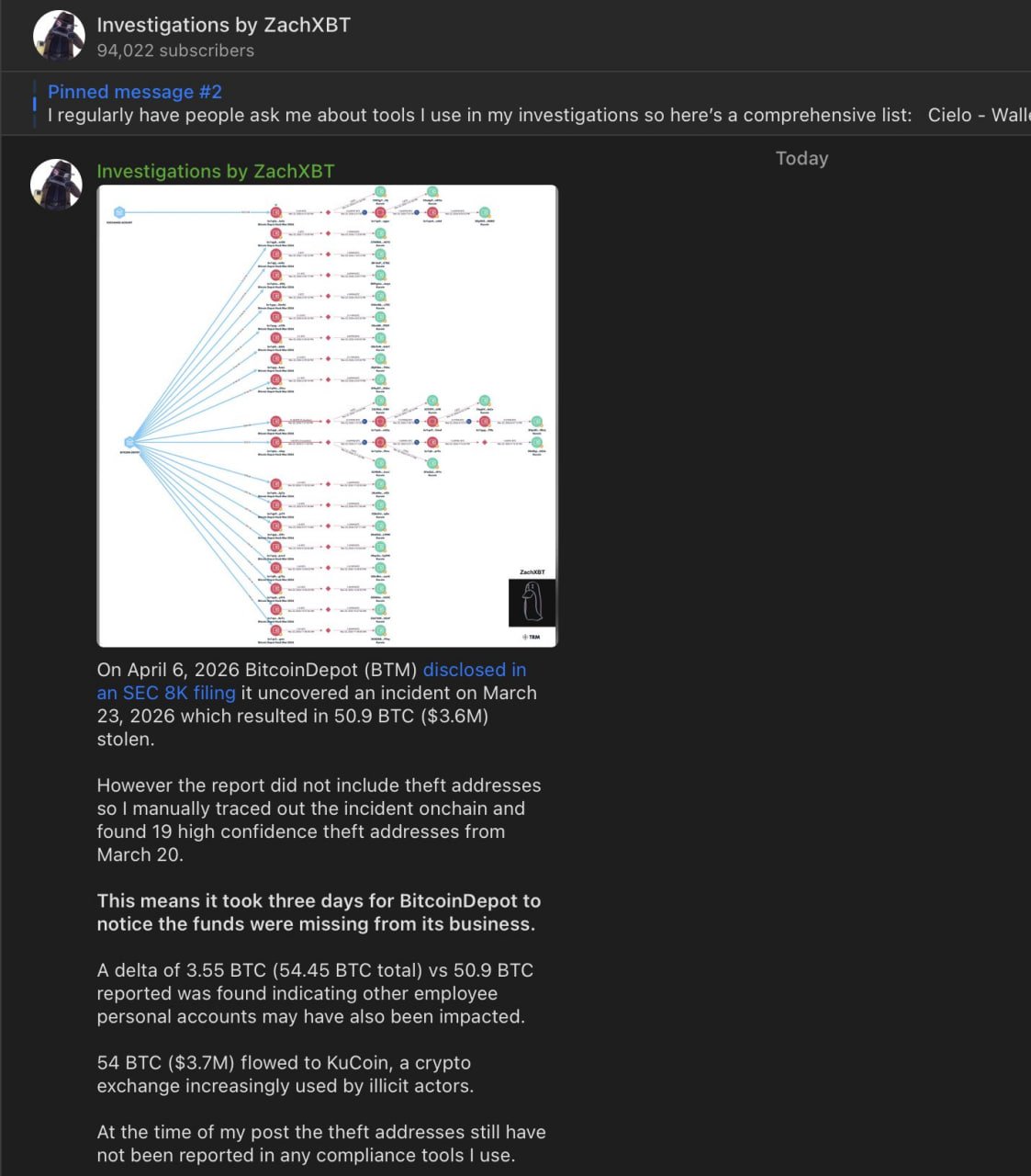 🚨 UPDATE: ZachXBT claims Bitcoin Depot lost 54 Bitcoin in breach, exceeding reported figures and had 3-day detection delay. https://t.co/uI2oYftgDS