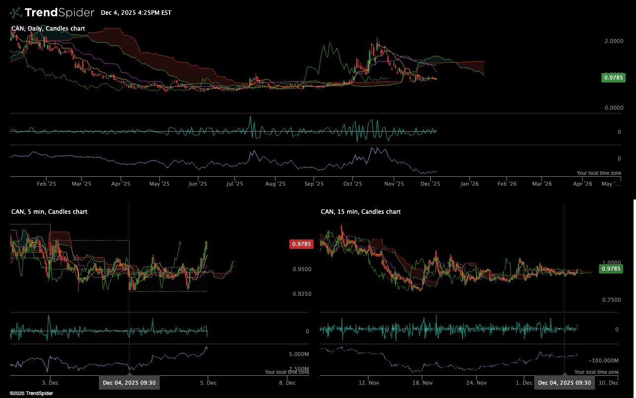 $CAN is in a clear downtrend across all timeframes, currently trading at $0.9785. The daily chart shows a breakdown from a multi-month consolidation zone ($1.05-$1.10), followed by a sharp decline into late November and continued weakness into December.